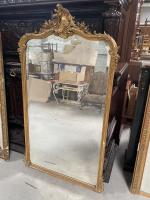 MIROIR en bois stuqué et doré à décor rocaille. Style Louis XV, miroir biseauté. 172 x 96 cm. Petits accidents et manques, glace piquée.