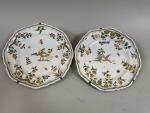 Deux ASSIETTES en faïence à décor d'animaux fantastiques. Moustiers, marque Oléry Laugier au revers. Époque XVIIIe siècle. D: 25 cm. Egrenures.