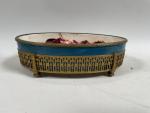 JARDINIERE ovale en porcelaine bleu et monture en bronze doré de style Louis XVI. Marque de la manufacture Impériale de Sèvres sous la base. 10 x 36 x 22 cm. Accident et fêle.