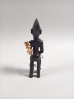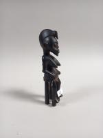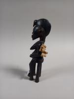 COTE D'IVOIRE, statuette de femme assise en bois exotique et collier de coquillages, SENUFO (?). 27x5x5 cm (fentes)