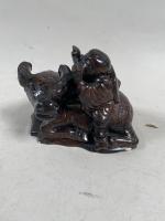 SUJET en plâtre patiné brun à décor d'un Sage sur un buffle. Chine, moderne. Accidents et manques. 11 x 14,cm.