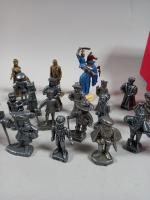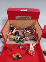Lot figurines en métal dont personnages de cirque, boxeurs et divers dans un boîte...