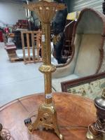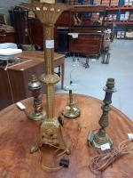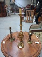 Lot comprenant un PIQUE-CIERGE en métal doré à décor repoussé style néo-gothique monté en lampe. H 52 cm. On y joint un BOUGEOIR en laiton monté en lampe et deux lampes de chevet en laiton. EN L'ETAT (accidents et manques)