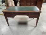 BUREAU plat en bois de placage dessus de cuir vert, ouvrant à cinq tiroirs en ceinture, les pieds gaines. Ornementation de bronzes ciselés et dorés. Style Empire. 76 x 140 x 75 cm. Accidents, manques.