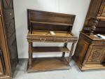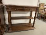 CONSOLE desserte en bois naturel et bois de placage ouvrant par deux tiroirs en ceinture, plateau mobile. De style Henri II, époque XXe siècle. Manque le marbre, accidents. 100 x 115 x 45cm