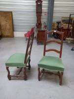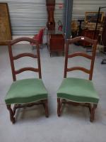 Une paire de CHAISES en bois fruitier à piètement en os de mouton relié par une entretoise en H , assises recouvertes de tissu vert. Style Louis XIII. H 107 cm (Petits accidents et usures des assises)