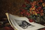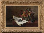 Ferdinand WAGNER (1819-1881). Nature-morte au vase fleuri et gravure des Fables de La Fontaine sur un...