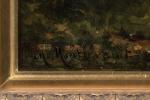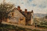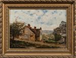 Charles MONTLEVAULT (1835-1897). Paysanne près d'une ferme. Huile sur toile. Signé en bas à gauche. 38 x 54 cm. Petits...