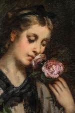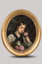 Armand DORE (1824-1882). Jeune fille au bouquet de roses. Huile sur toile de format ovale. Signé au milieu à droite. 65,5 x 55 cm. Rentoilage. OH