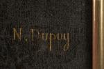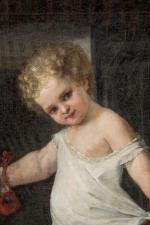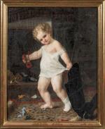 Noémie Marguerite DUPUY (XIXème siècle). Enfant jouant avec une botte de cavalier. Huile sur toile. Signé en haut...