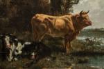 École française du XIXème siècle, dans l'entourage de Constant TROYON (1810-1865). Taureau et vache près d'un...