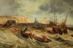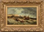 Eugène ISABEY (1803-1886). Le retour des pêcheurs au port dans la tempête. Huile sur toile. Signé des...