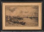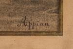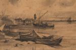Adolphe APPIAN (1818-1898). Barque de pêcheurs au bord de l'eau. Fusain sur papier bistre. Signé en...