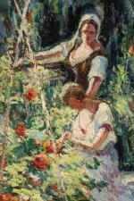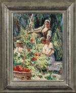 Joseph MEISSONIER (1864-1943). La cueillette des tomates. Huile sur panneau. Signé en bas à gauche. 34,5 x 26 cm. OH
