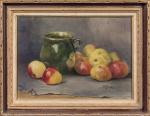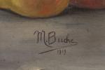 M. BUCHE (XXème siècle). Nature morte aux pommes. Huile sur carton. Signé en bas à droite. 33 x 46 cm. Accident en bas au milieu. OH