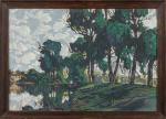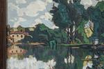 Eugène BROUILLARD (1870-1950). Les grands arbres près de l'écluse. Huile sur carton. Signé en bas à droite. A vue : 53 x 76 cm. OH