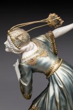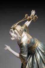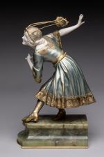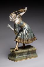 Sujet en bronze polychrome et parties en ivoire, tête et bras, sur socle en onyx vert bordé de bronze doré. Signé et porte le n° 8260. H. 43 cm L. 24 cm.