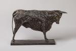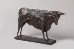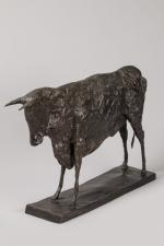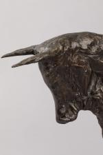 Christian Maas (né en 1951) « Taureau » Sujet en bronze à patine noire. Marqué. H. 33 cm L. 54 cm Infimes oxydations. TR