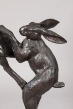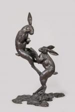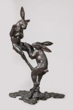 Christian Maas (né en 1951) « Lapins au clair de lune » Groupe en bronze à patine brune nuancée. Signé. H. 160 cm L. 70/102 cm TR