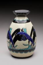 Keramis Vase de forme ovoïde à col ouvert en céramique polychrome à décor d'hirondelles sur...