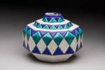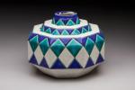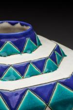 Vase à pans coupés en céramique polychrome à décor géométrique sur fond blanc. Signé et marqué D 1185. H. 18 cm L. 23 cm