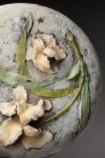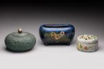 Ensemble de trois céramiques comprenant un cache-pot long et une bonbonnière en barbotine, un pot couvert en terre grenelée. L. 26 cm maxi. Petits éclats. TR