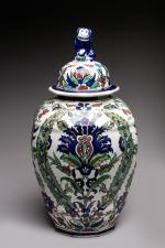 Keramis Pot couvert de style oriental à décor polychrome inspiré de la Perse sur fond blanc...