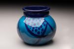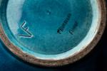 Vase de forme boule à col retourné en céramique bleue à décor géométrique ton sur ton. Signé. H. 20 cm
