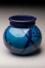Primavera Vase de forme boule à col retourné en céramique bleue à décor géométrique ton sur ton. Signé. H. 20 cm infime manque à l'émail. TR