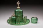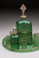 Ensemble de service « parlant » en verre vert givré gravé et émaillé doré. Il comprend un flacon « Parfum de vertus » H. 29 cm, un flacon « Au gui l'an neuf » H. 15 cm, une vase pansu « Mon coeur avec », un plateau à bords chantournés D. 30 cm et sept petits verres sur pied avec maximes dont quatre intacts et trois fêlés ou cassés. Signés.