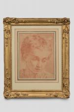 ECOLE FRANCAISE de la fin du XVIIIème siècle. "Tête de petit garçon". Sanguine. 31 x 24 cm (à vue). Petites déchirures, restaurations. RM
