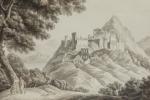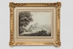 ECOLE FRANCAISE du XIXème siècle. "Paysans près des ruines d'une ville antique en Italie". Lavis...