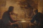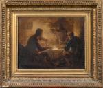 Attribué à Benjamin Gerritsz CUYP (1612 - 1652) Les Pèlerins d'Emmaüs Panneau de chêne, une planche, non parqueté 33 x 43 cm Restaurations. RM