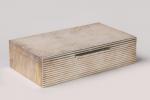 PUIFORCAT orfèvre. BOITE à cigarettes en argent à larges rainures à deux compartiments, intérieur bois. 4,5 x 10 x 18 cm. Poids brut : 560 g. Griffures et infimes enfoncements.