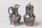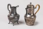 Petite VERSEUSE égoïste à anse garnie d'osier et pot à crème en argent. Poids brut : 250 g. Petites déformations.
