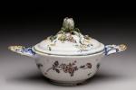 MEILLONNAS. BOUILLON couvert en faïence à décor de fleurs polychromes, frise en forme de rose feuillagée, deux anses latérales à décor rocaille. Époque XVIIIème siècle. 17 x 26 x 17 cm. Cheveux, éclats.