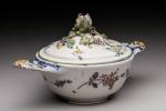 MEILLONNAS. BOUILLON couvert en faïence à décor de fleurs polychromes,...