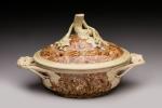 APT. Petit BOUILLON couvert à anses en faïence à l'imitation du marbre, anses latérale en feuille de vigne. Epoque XVIIIème siècle. H. 13, D. 21 cm. Très légers éclats, restauration.