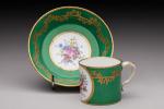 SEVRES. Petite tasse et sa soucoupe en porcelaine tendre à décor floral polychrome en réserve, marli à fond vert à décor de frises dorées partiellement amaties à l'agate. Époque XVIIIème siècle. Tasse : H. 4,5 cm ; soucoupe : D. 10,5 cm. Défauts de cuisson, fêle à la soucoupe et restaurations.