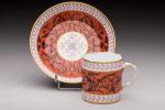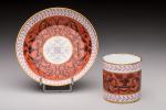 SEVRES. Tasse et sa soucoupe en porcelaine à décor en bandeaux sur fond terre de Sienne d'entrelacs et d'oiseaux, entourée de deux guirlandes de feuillage roses sur fond blanc. 1785. Tasse : H. 6 cm ; soucoupe : D. 12,4 cm. Petites usures à la dorure.
