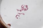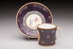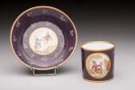 SEVRES.Tasse et sa soucoupe en porcelaine à décor de semis de fleurette sur fond violet et au centre de chinois dans des paysages dans des réserves. 1777 ou 1778 (?), peintre Castel (?). Tasse : H. 5,8 cm ; soucoupe : D. 12,3 cm. Petites usures à la dorure.