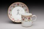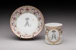 NIDERVILLER (?). Tasse et sa soucoupe en porcelaine blanche à décor polychrome d'un A fleuri et couronné dans une réserve ovale et de guirlandes de fleurs polychromes et or. Époque fin XVIIIème siècle. Marque N au tampon rouge. Tasse : 7 cm ; soucoupe : D. 13,3 cm. Un défaut de cuisson à la soucoupe, égrenures au talon de la soucoupe, usures et petites reprises en dorure.