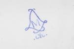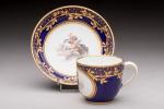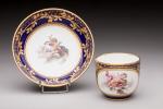 SEVRES. Tasse et sa soucoupe en porcelaine blanche à décor polychrome d'angelots dans des réserves, marli à fond bleu à décor de branchages dorés amatis à l'agate et yeux de perdrix. 1765, Chabry Fil peintre (?). Tasse : H. 6 cm ; soucoupe : D. 13,4 cm. Infimes usures de dorure à la base de la tasse.