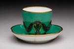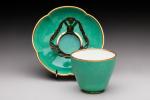 SEVRES ou PARIS (?). GOBELET et soucoupe polylobée en porcelaine vert poudré à liseré et...