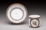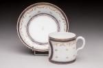SEVRES (?). Tasse et sous-tasse en porcelaine blanche à décor d'instruments de musique dans des réserves, à encadrements bleu nuit, et entrelacs dorés. Époque fin XVIIIème siècle. Tasse : H. 6 cm ; soucoupe : D. 12,6 cm. Infimes manques à la dorure.
