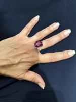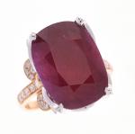 BAGUE deux ors 750/°°, le chaton formé de deux papillons bicolore sertis de diamants entourant un rubis ovale de 14.89 ct. Avec certificat indiquant sans traitement thermique constaté. Tour de doigt : 53. Poids brut : 9.3 g. Rayures et petites égrisures.