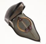 Une FIBULE en or 750°/°° ciselé à décor de trois boules serties d'améthystes. Epoque fin...