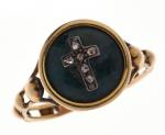 BAGUE "Dizainier" en or jaune 750/°°, le plateau rond émaillé vert surmonté d'une croix en argent sertie de diamants taillés en rose. Epoque XIXème siècle. Tour de doigt :53. Poids brut : 2.1 g.