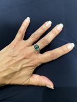 BAGUE "Dizainier" en or jaune 750/°°, le plateau rond émaillé vert surmonté d'une croix en...
