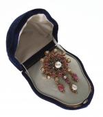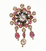 BROCHE devant de corsage "Fleur" en or jaune 750/°° centrée d'une perle probablement fine formant le pistil, les pétales émaillés noir, entourage de rubis cabochon et diamants de taille ancienne. Il se termine par trois pampilles serties de cabochons percés de rubis pour deux et d'une perle baroque pour la centrale. Epoque Napoléon III.